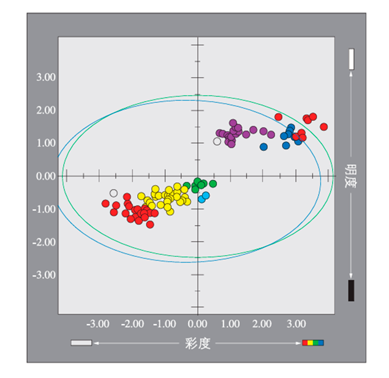 SLI-Taper的另一功能,是“聚类分组Clustering and Grouping”;实际应用中,颜色数据的分布还会以另一种方式影响排色效果。因为上述排色方法仅在颜色数据分布相对均匀时才表现良好。若数据标绘后呈现出明显的子组(即 “聚类”)特征,直接采用线性或最小路径法对整组数据排色,效果往往不佳。