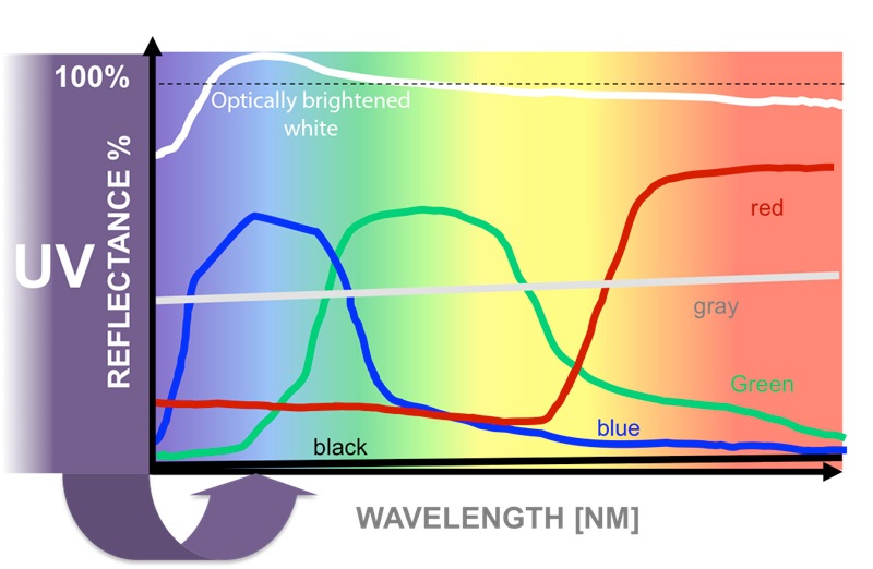 我们周围有数量惊人的"白色"材料——纸张、纺织品、包装、塑料——本身根本不是天然的白色。制造商通常在颜色配方或基础材料中添加荧光增白剂,以创造出视觉上更亮的白色。荧光增白剂的工作原理是吸收我们看不到的紫外光,并将其重新发射到我们能看到的蓝色光谱区域。我们的眼睛会认为这种白色比不含荧光增白剂的白色更亮。