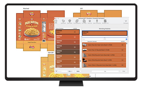 PantoneLIVE的强大之处在于采用了从属标准,可针对特定基材提供理想的可实现色彩。因此,品牌商和生产团队无需尝试在牛皮纸上匹配主标准(往往根本无法实现),而可以边设计边查看色彩呈现效果,并根据该材料接近的可实现色彩目标做出决策。