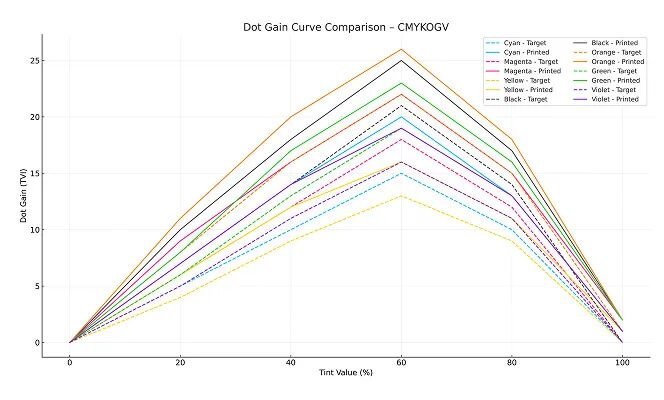 在CMYK以及CMYKOGV等扩展色域工艺中,网点增大是衡量印刷质量的关键指标。当油墨在承印物上铺展时,实际印刷的网点会比预期更大,从而改变色彩平衡和图像清晰度。若管理不当,即使是微小的网点增大变化也可能导致可见的不一致性。