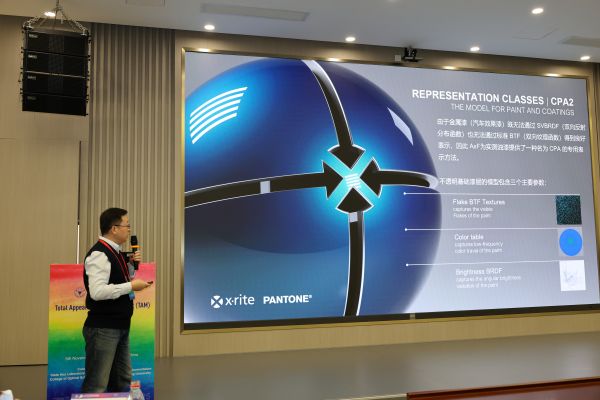 爱色丽大客户技术经理Steven Yan在会上发表了题为《数字虚拟呈现:爱色丽的色彩与外观一体化测量方法》的主题报告。他系统介绍了爱色丽以Pantora数字材质中心、AxF材质交换格式及MAT12等光谱测量设备为核心的完整外观数字化解决方案。该方案致力于构建从数据采集、处理到可视化渲染的全链路生态系统,帮助企业高效实现从物理样本到高保真数字孪生的转化,优化产品开发流程。