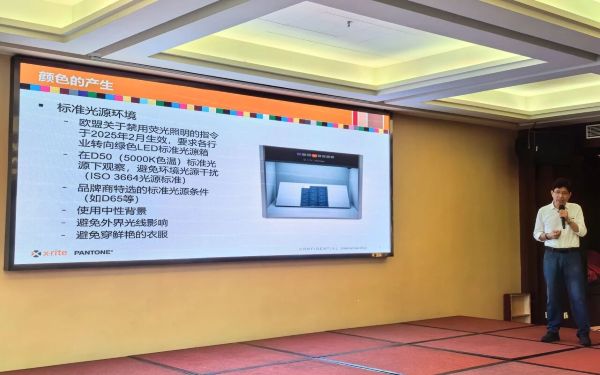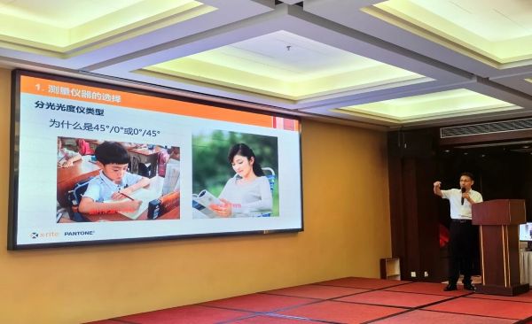 在主题演讲环节,爱色丽高级应用工程师陈长春首先系统阐释了《色彩基础原理及应用》,从光源、物体、观察者三要素出发,深入剖析标准光源环境、反射光谱原理及印刷质量控制的关键参数,为与会代表建立起科学的色彩管理理论框架。