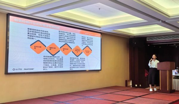 裕同集团资深技术经理苏小燕女士在随后的分享中,重点阐述了如何通过爱色丽全套色彩管理工具构建数字化色彩新生态。面对跨媒介、跨工厂的全球色彩协同挑战,裕同依托爱色丽的分光光度仪及PantoneLIVE数字标准,结合G7、PSO等专业标准,建立起标准化、自动化与数据驱动的色彩控制体系。她强调,爱色丽的解决方案有效帮助企业在多地生产中实现色彩一致,显著提升品控效率和可持续生产能力,共同推动行业智能化转型。